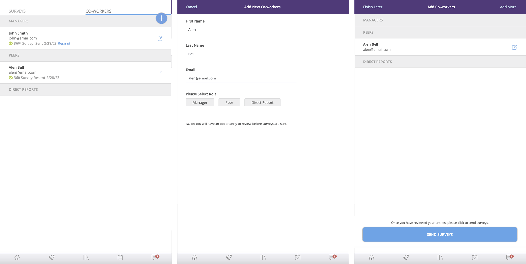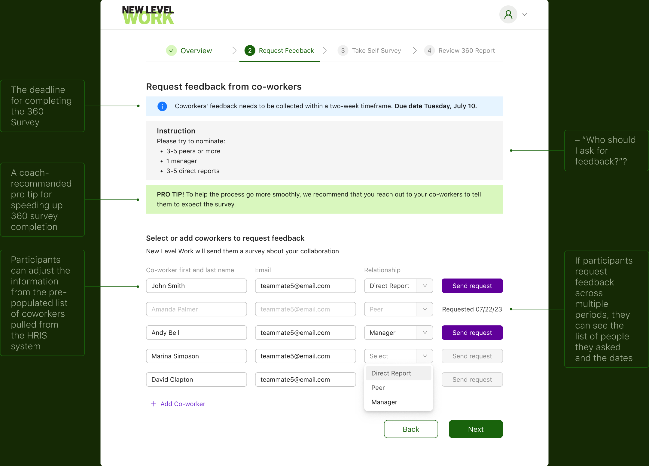 We decided not to include the “Select all coworkers” feature, which would have sent feedback requests to all coworkers.