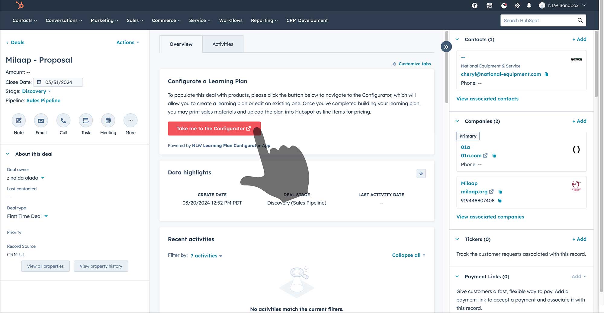 The sales rep can launch the Sales Configurator from their CRM profile. This will assist sales representatives in tracking sales progress and gathering historical data.